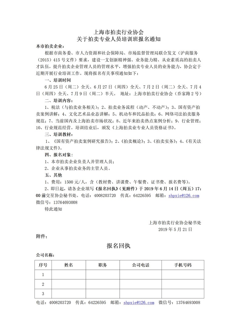上海市拍卖行业协会 关于举办拍卖专业人员《资格证书》培训报名通知